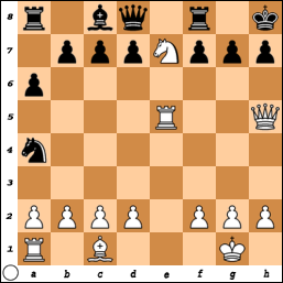 (la menace 13.Dxh7+ suivi de Th5 mat ne peut être parée convenablement, dans la megabase les blancs ont 100% dans cette position) g6 (d'autres parties se sont poursuivies par 12...d6 13.Dxh7+ 1-0) 13.Dh6