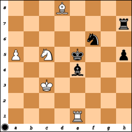 Position de la partie au début de la vidéo, les noirs ne peuvent éviter la perte d'une pièce. Le GMI a tenté 1...Rd5 ( avec l'idée 2.Fxf6? Tc7!) mais après 2.Rb4! la pièce est perdue...